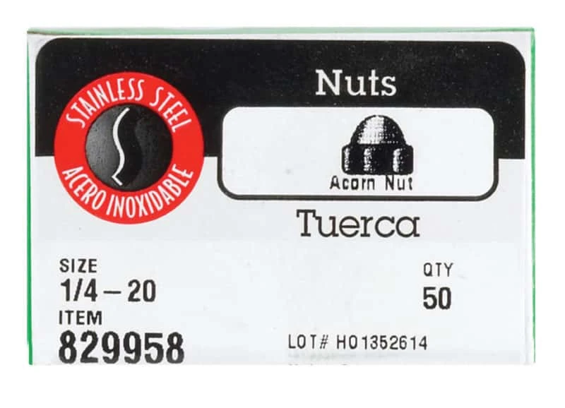 Stainless steel acorn cap nuts are hex nuts with a partially internally-threaded dome shape. The dome offers protection of exposed screw threads and a decorative appearance as a finishing fastener. The cap nut also protects the user from injury by covering exposed threads. Parts have a stainless steel finish for best-in-class corrosion resistance. * 1/4-20 coarse thread size Stainless steel finish for best-in-class corrosion resistance 50 pieces per retail package