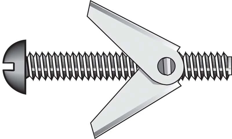 Toggle bolts come with spring-action wings and are intended for anchoring into hollow walls. The wing is designed to spread apart behind the base material upon installation for firm hold in hollow wall applications. The wing disperses the weight of the secured item over a larger area, increasing the weight that can be secured compared to a regular bolt. Slotted round head screw Medium duty Used on drywall, plaster, hollow block and tile
